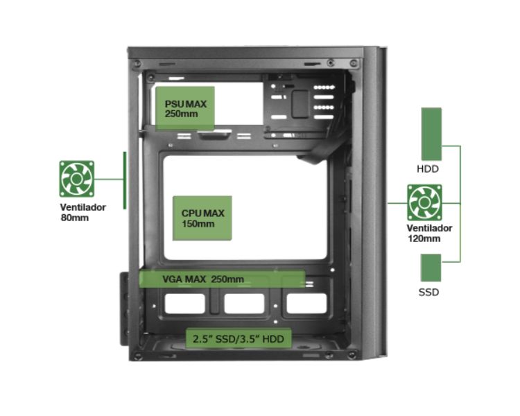 Bahias: Internas: 2 x 3'5, 2 x 2'5 Color del Producto: Negro Conectores: USB 2.0 x 1, USB 3.0 x 1, Audio In/Out F.A.: No Formato: Micro ATX Formato F.A.: ATX Medidas: 291 x 188 x 345 mm Potencia F.A.: Sin fuente